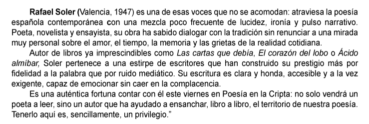 Viernes 21 -19h en el Cafetín, presentación en sociedad del libro “POESÍA EN LA CRIPTA ANTOLOGÍA (2017-2025)” en la que aparecen muchos de los poetas que han participado en este ciclo poético. Un acto lleno de sorpresas y poesía. Nos vemos