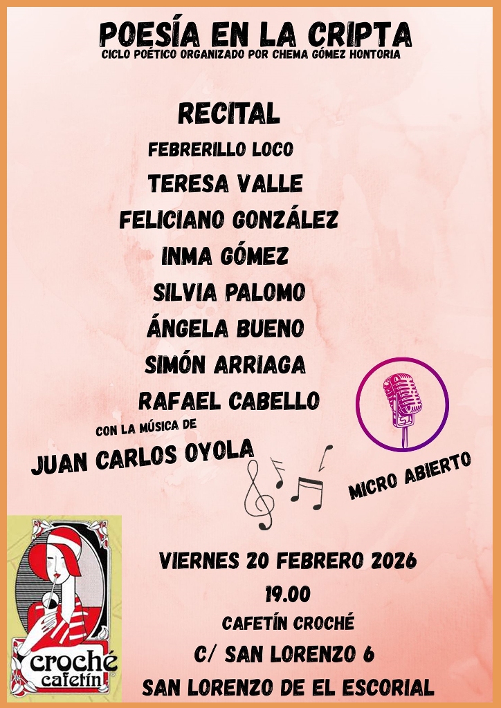 Este viernes 20 de febrero, febrerillo loco, vuelve Poesía en la cripta con un gran recital que os va a gustar a todos y que como de costumbre une diversas voces y estilos. No os lo perdáis. Nos vemos el viernes 20 a las 19h!