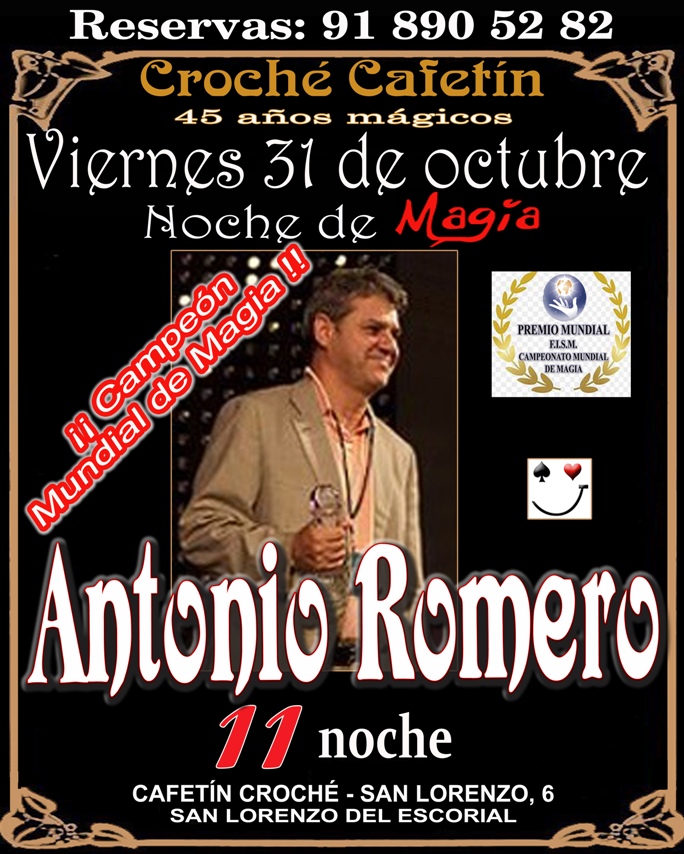 VIERNES 31 OCTUBRE, LA MAGIA DE ANTONIO ROMERO Publicado el 27 octubre, 2025 por admin Uno de los mejores y más creativos magos del momento. CAMPEÓN MUNDIAL DE ILUSIONISMO. No te lo puedes perder! Cafetín Croché, TEMPLO DE LA MAGIA desde su inauguración en 1981