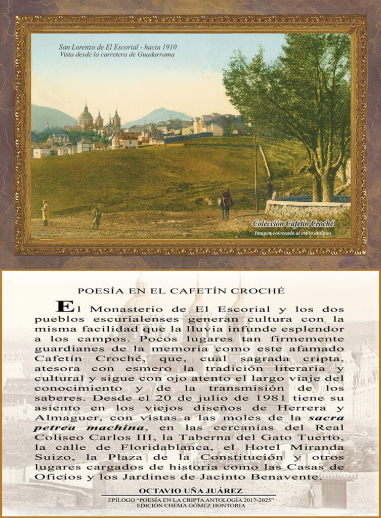 Adjuntamos la habitual imagen del Escorial antiguo recogida en la felicitación postal navideña del Cafetín. El texto que la acompaña, de Octavio Uña Juárez, forma parte del epílogo al libro «Poesía en la Cripta – Antología 2017-2025« edición de Chema Gómez Hontoria.